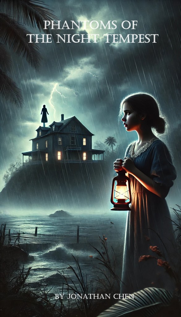 Phantoms of the Night Tempest is a suspenseful thriller set in a small coastal town during a fierce storm. Seventeen-year-old Jasmine finds herself alone in her family’s old, creaky house perched on a cliff, battling a sense of foreboding as the storm rages outside. When she glimpses a shadowy figure beyond the tree line during a lightning flash, her unease turns to fear.